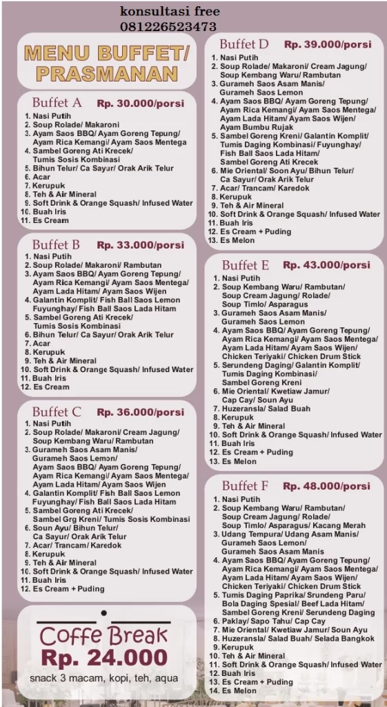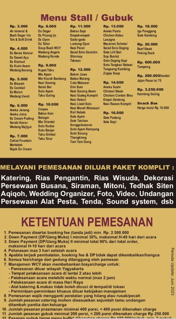 Percayakan kebutuhan catering pernikahan Anda kepada tim kami yang berpengalaman dan berdedikasi dalam memberikan layanan terbaik. Kami siap menjadi partner terpercaya untuk menghadirkan hidangan lezat, tampilan mewah, dan pengalaman kuliner yang tak terlupakan. Kami melayani test food untuk calon klien max 2 orang di acara acara kami. Paket dijamin sesuai pesanan baik jumlah dan besarnya porsi sesuai dengan kesepakatan. Hubungi kami sekarang dan wujudkan hari bahagia Anda dengan sajian terbaik dari catering wedding pilihan di Jogja. Konsultasi 081226523473
