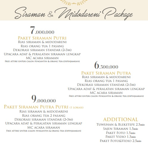 Untuk anda yang belum mengetahui tatacara dan prosesinya atau mungkin tidak sempat mempersipakannya maka kami bersedia membantu melaksanakan dengan memberi paket midodareni dan paket siraman di Yogyakarta. Paket itu adalah sebagai berikut :